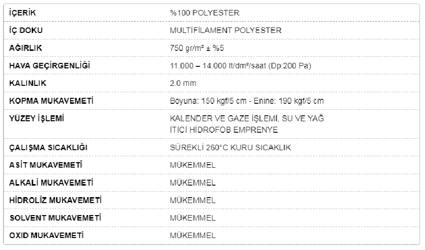 Sürekli çalışma sıcaklığı 260°C olan polyester PTFE filtre torbaları birçok sektörde tercih edilmektedir. Asitlere ve oksitlere karşı yüksek direnç sağlayan polyester PTFE filtre torbaları aşınmalara karşı güçlüdür. Hidrofob Emprenye işlemi yapılarak su ve yağ itici özellikleri bulunan polyester filtre torbasını, tozun su ve yağlı şekilde geldiği sektörlerde rahatlıkla kullanabilirsiniz. Bir tarafı gazeli olan torbalar tozun yüzeyden rahatlıkla kayarak torbaya tutunmasını engellemektedir.